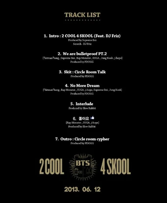 2 cool 4 skool album cover album track list. 2 cool 4 skool. History talk 0 trending pages. 2 cool 4 skool is the debut single album by south korean boy band bts the album was released on june 12 2013 through big hit and distributed by loen the album was promoted by two singles no more dream and we are bulletproof pt 2.