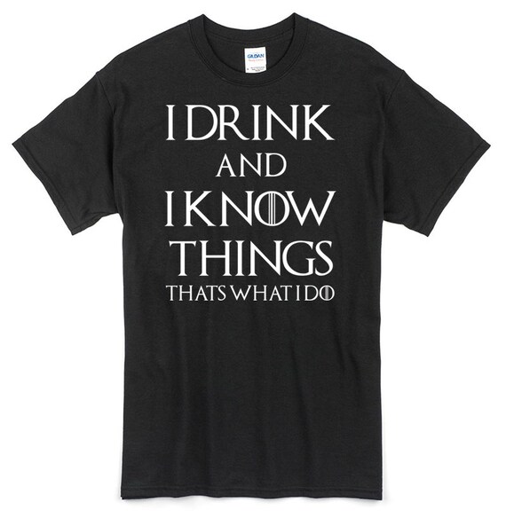 This shirt features the infamous phrase i drink and i know things quoted to tyrion lannister with the house this iconic phrase from the hbo series game of thrones was used by tyrion lannister to shut down questions about his knowledge of the existence of dragons but you don t need to be an expert to wear this tee.