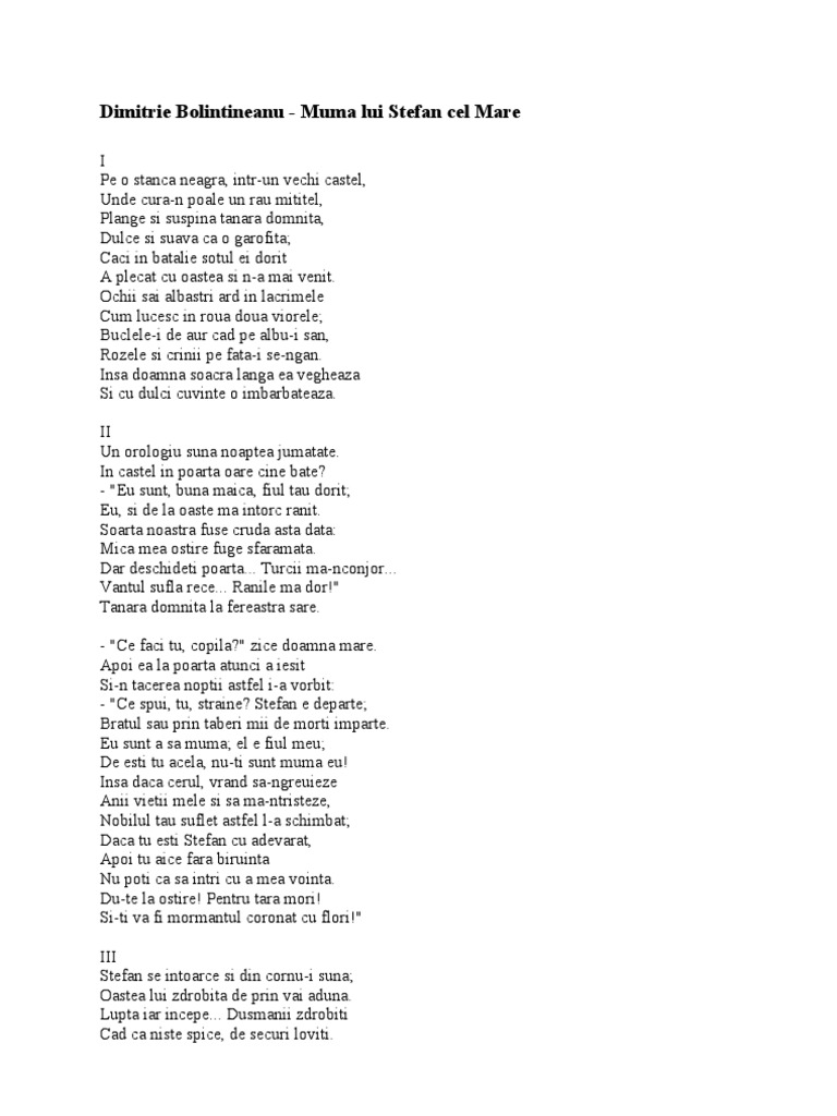 Pe o stanca neagra. Pe o stanca neagra intr un vechi castel stã stefan cel mare si facea pe el unde curge n vale un râu mititel. Salutare prieteni nu uitati sa va abonati la canalul meu. Un orologiu sunã unu si jumate. I pe o stanca neagra într un vechi castel unde cura n poale un rau mititel plange şi suspina tanara domniţa dulce şi suava ca o garofiţa.
