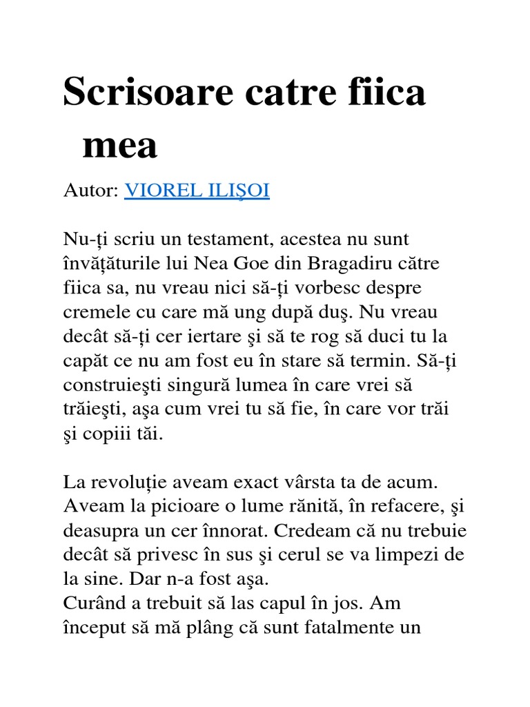 Amintirea acelui moment s a intiparit in inima mea pentru tot restul timpului care a venit dupa. Scrisoare către fiica mea. M am gândit să i scriu scrisoare fiicei mele.