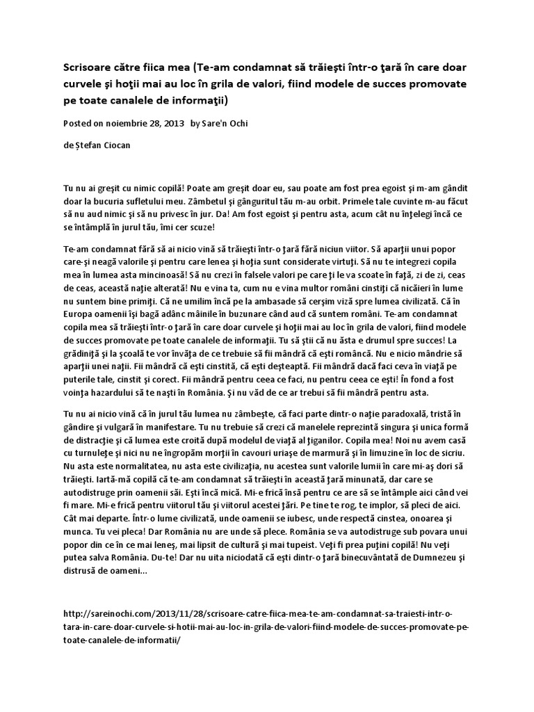 Scrisoare catre fiica mea. Draga mea alesia în fiecare an de ziua ta am la fel de multe emoții ca și în ziua în care te am adus pe lume. Să trăieşti mimilica dragă să fii bună să fii bună pentru ca să poţi fii fericită. La început eram cu gândul că în calitate de mamă ar trebui să umplu această scrisoare cu sfaturi despre cum fiica să şi trăiască viaţa pentru a nu ajunge la regretele pe care le am eu. Mi ai tinut degetul cu mana ta micuta si mi ai zambit.